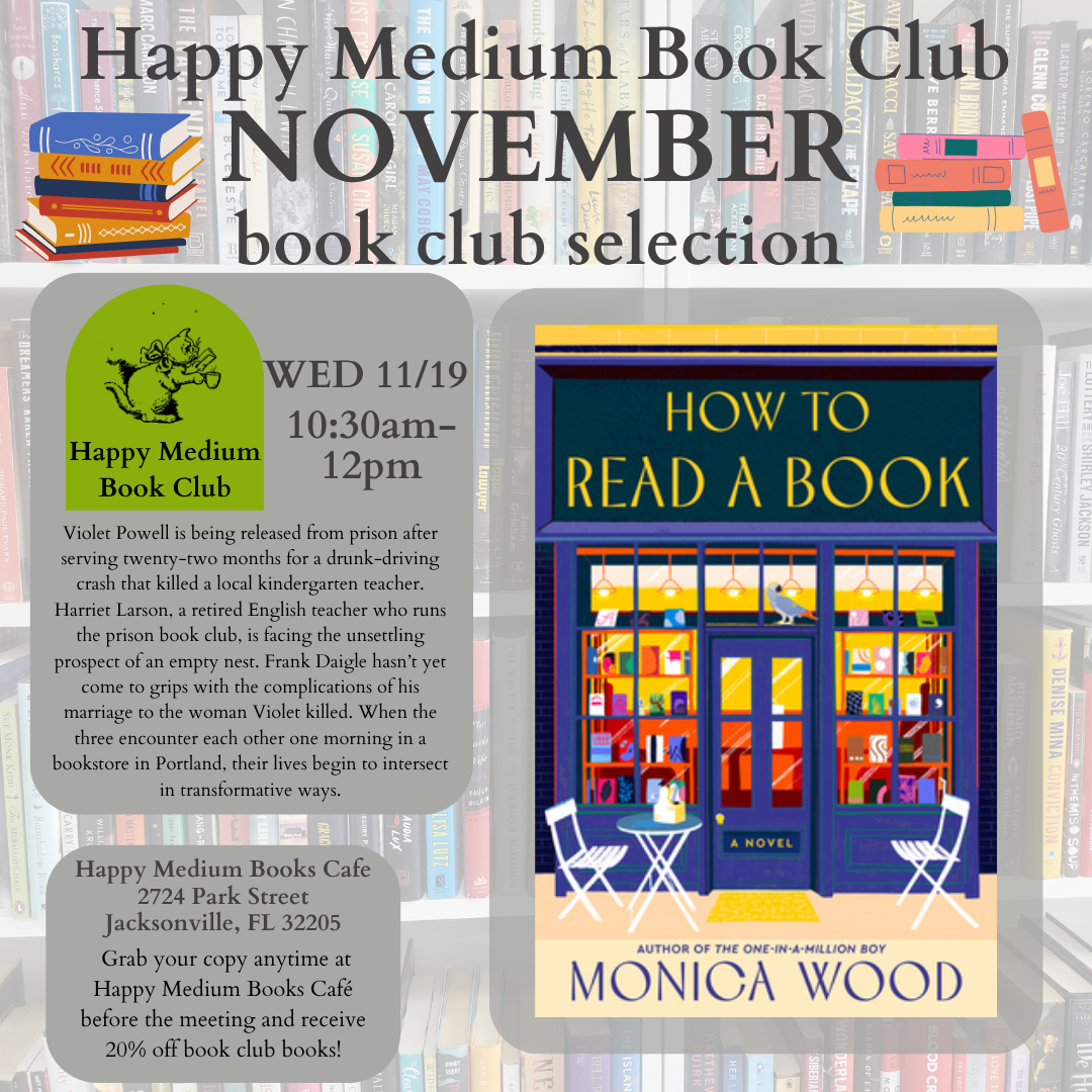 Join us at the café as we discuss How to Read a Book by Monica Wood. As always, book club books are 20% off at Happy Medium Books Café.