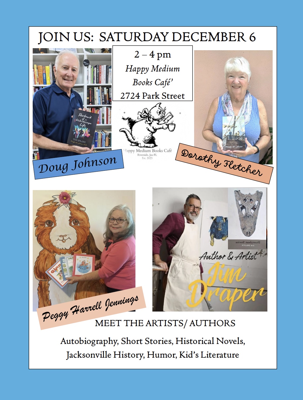 Happy Medium Books Café is THE community bookstore hotspot in Jacksonville, FL, for book events, book signings, Book Club meetings, ArtTalks, and writing classes from national award-winning authors and writers. Mothers love Saturday’s Storytime for children where kids listen intensely to a book reading, play on the train table, or sleep on the tiny couch. Older folks come to knit, listen to the music or meet their friends and just hang out in our little community meeting place. Be sure to check our Events weekly – you may find something you don’t want to miss. Bring a friend, too!