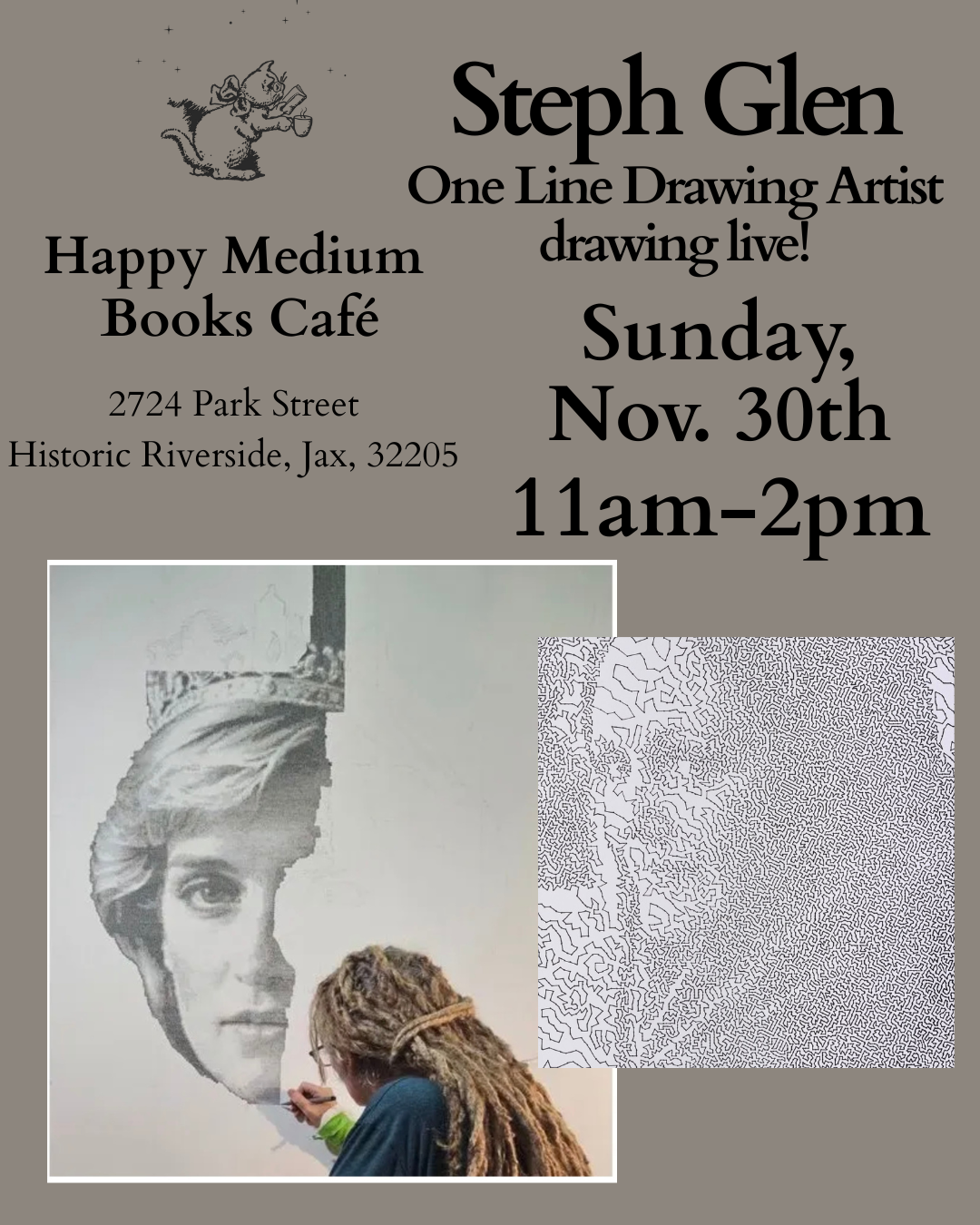 Stop by and meet one line artist Steph Glen Ducase and see how she creates her works of her art. Steph's artwork are for sale at Happy Medium Books Café. |