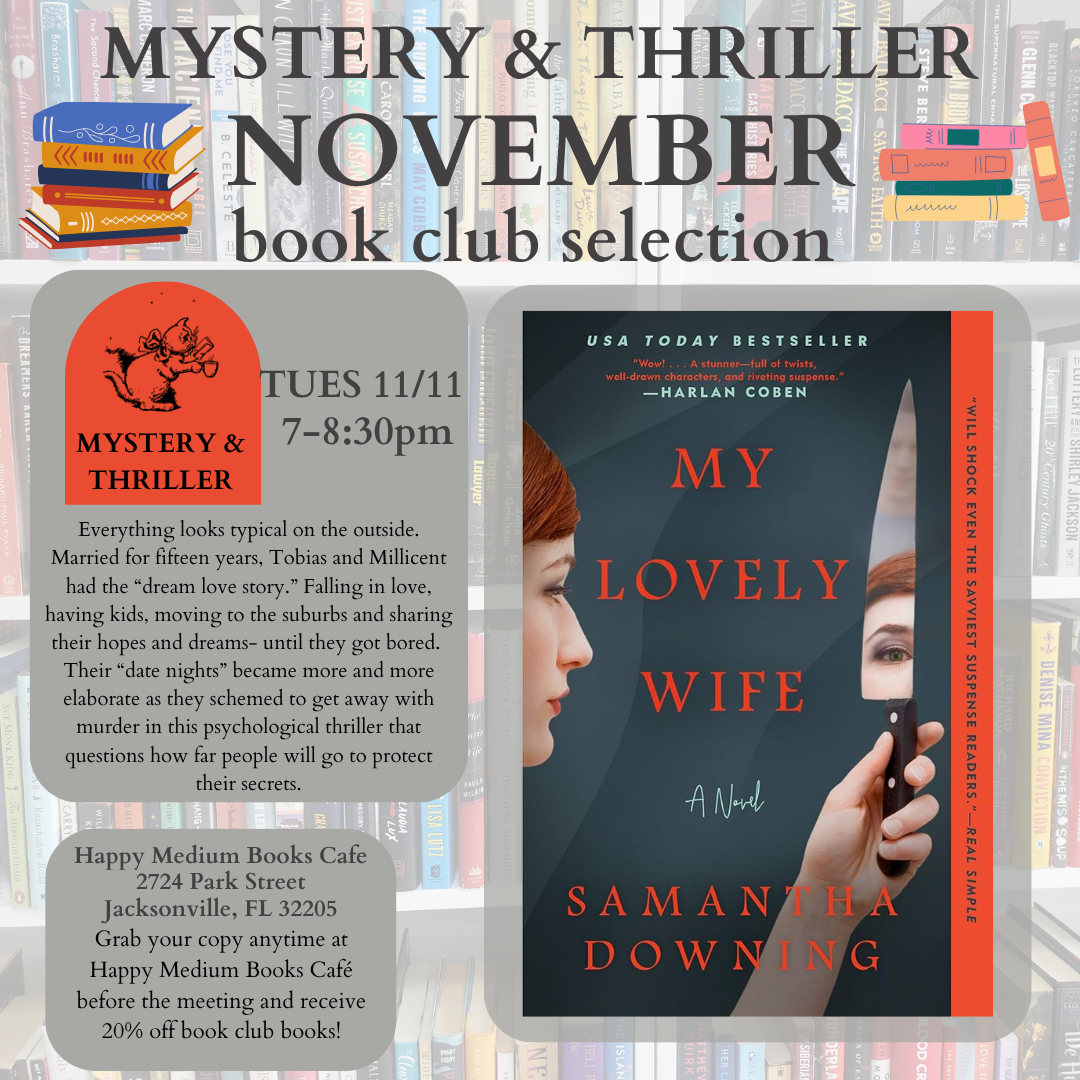 Join us at the cafe as we discuss My Lovely Wife by Samantha Downing. As always, Book Club Books are 20% off at Happy Medium Books Café |