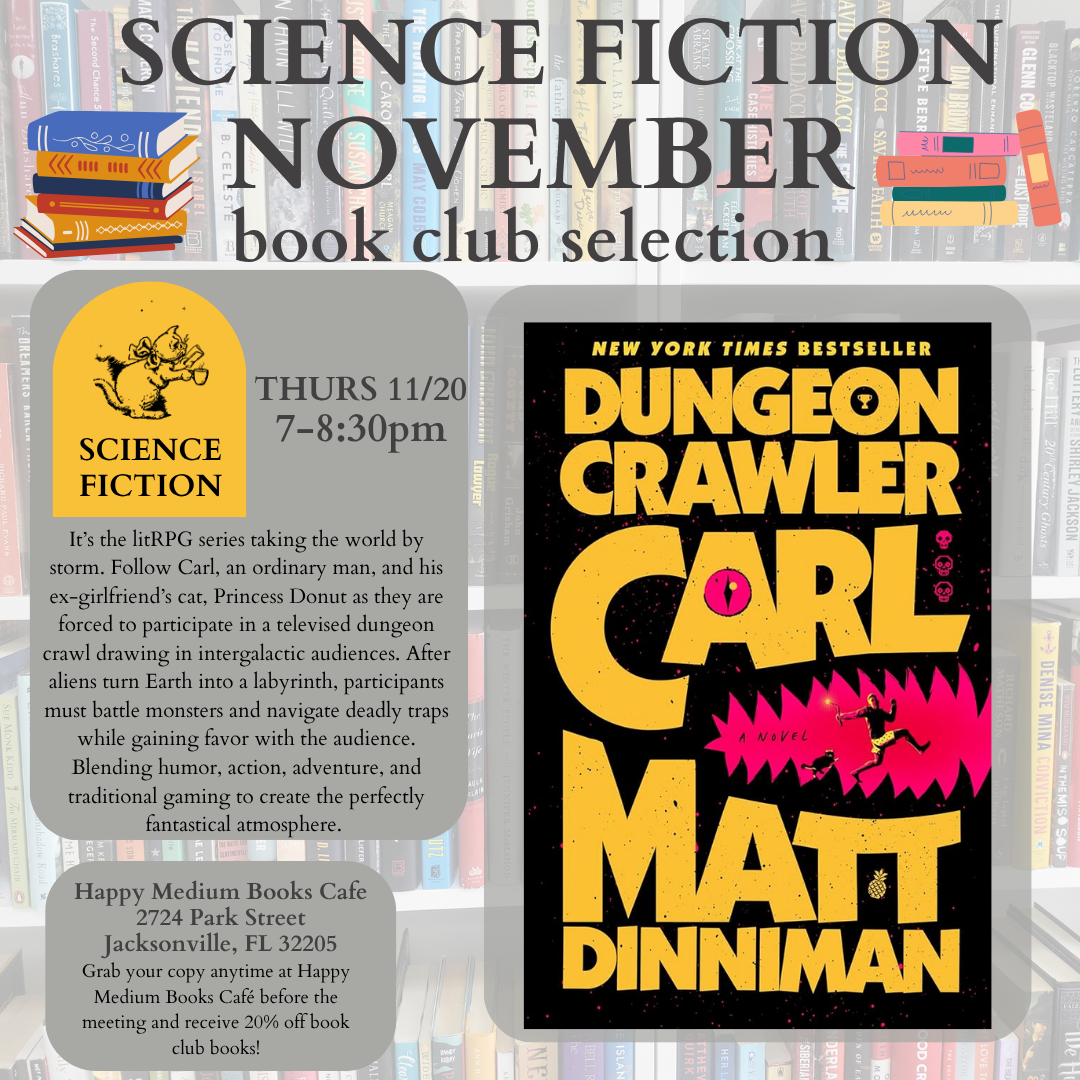 Join us at the Café as we discuss Matt Dinniman's best selling book Dungeon Crawler Carl. As always, Book Club Books are 20% off at Happy Medium Books Café. |