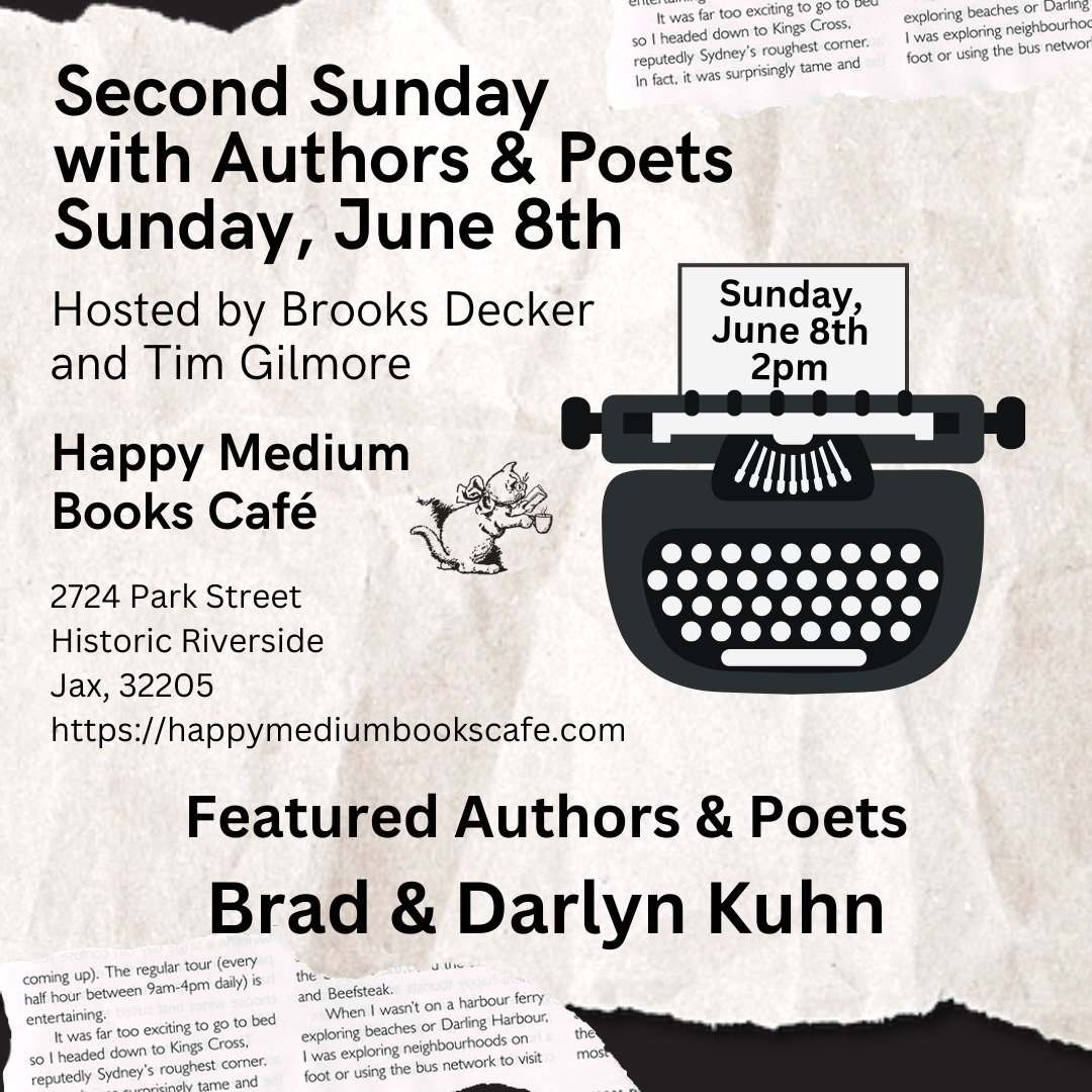 Happy Medium Books Cafe 2724 Park St, Jacksonville, FL, United StatesFor seven years, Darlyn and Brad co-directed the JaxbyJax Literary Arts Festival. Come to Happy Medium and hear them read their work! Brad and Darlyn Kuhn, founders of the PR […]