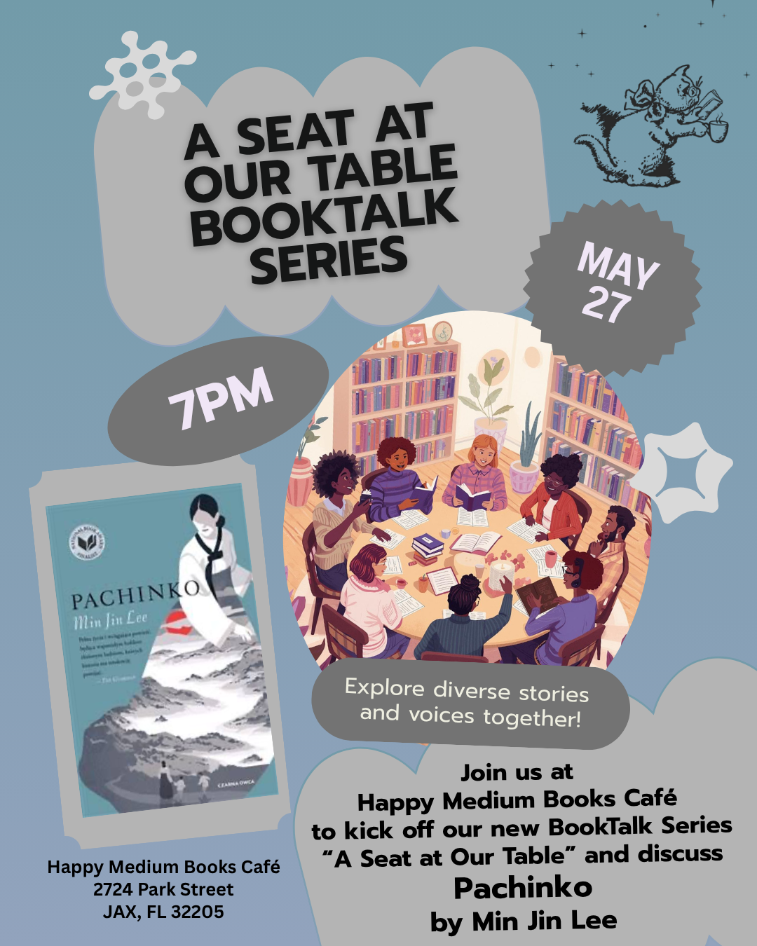 Happy Medium Books Cafe 2724 Park St, Jacksonville, FL, United StatesJoin us at the café as we discuss Pachinko by Min Jin Lee. As always, Happy Medium book club books are 20% off at Happy Medium Books Café.