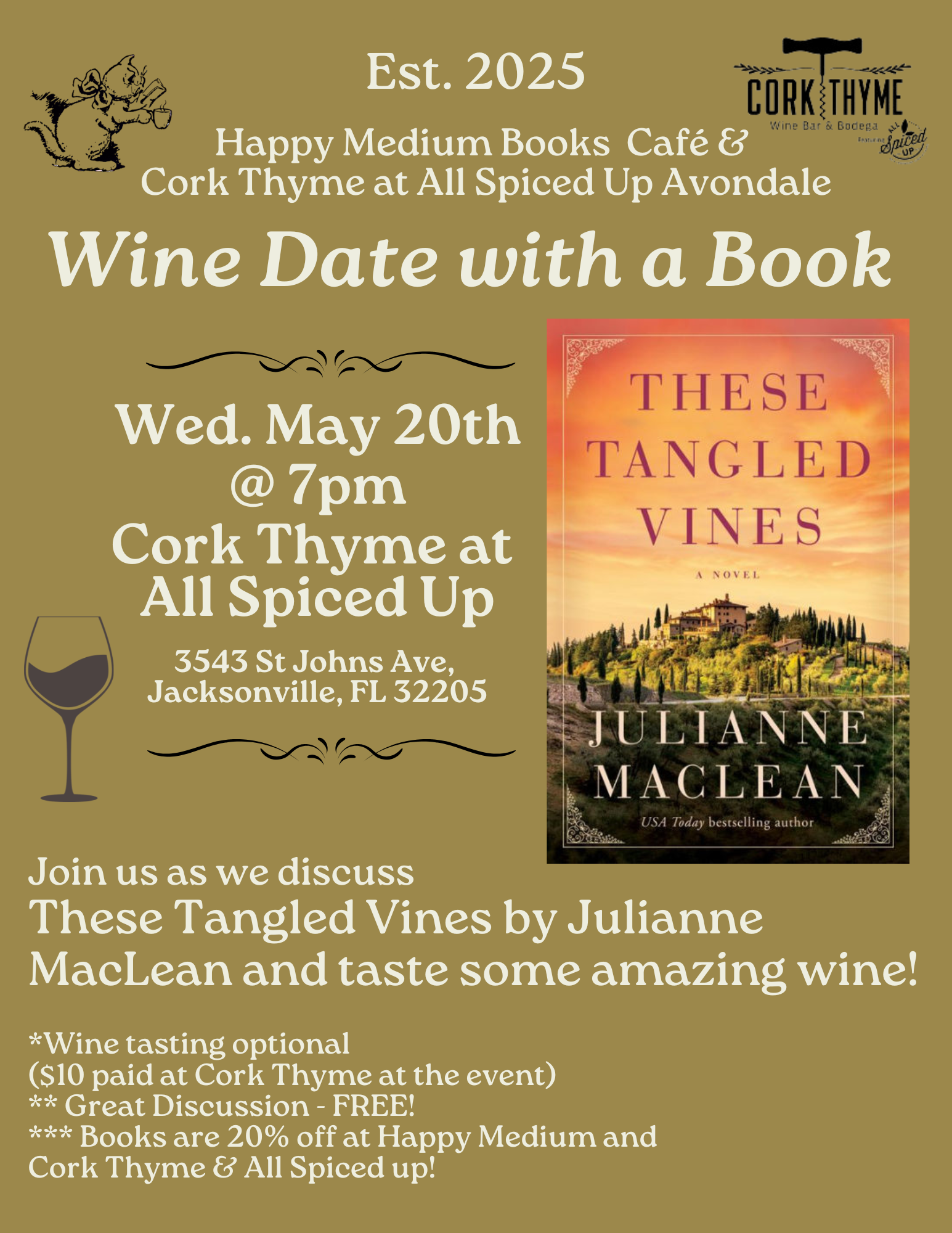 Cork Thyme @ All Spiced up Avondale 3543 St Johns Ave, Jacksonville, FLJoin us at Cork Thyme at All Spiced Up in Avondale to discuss These Tangled Vines by Julianne MacLean. As always, Happy Medium Book Club books are 20% off at Happy Medium Books Café. No sign up needed, just show up. Bring a friend, or make new ones!