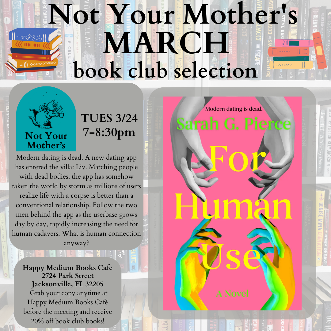 Happy Medium Books Cafe 2724 Park St, Jacksonville, FL, United StatesJoin us at the cafe as we discuss For Human Use by Sarah G Pierce. As always, Book Club Books are 20% off at Happy Medium Books Cafe.