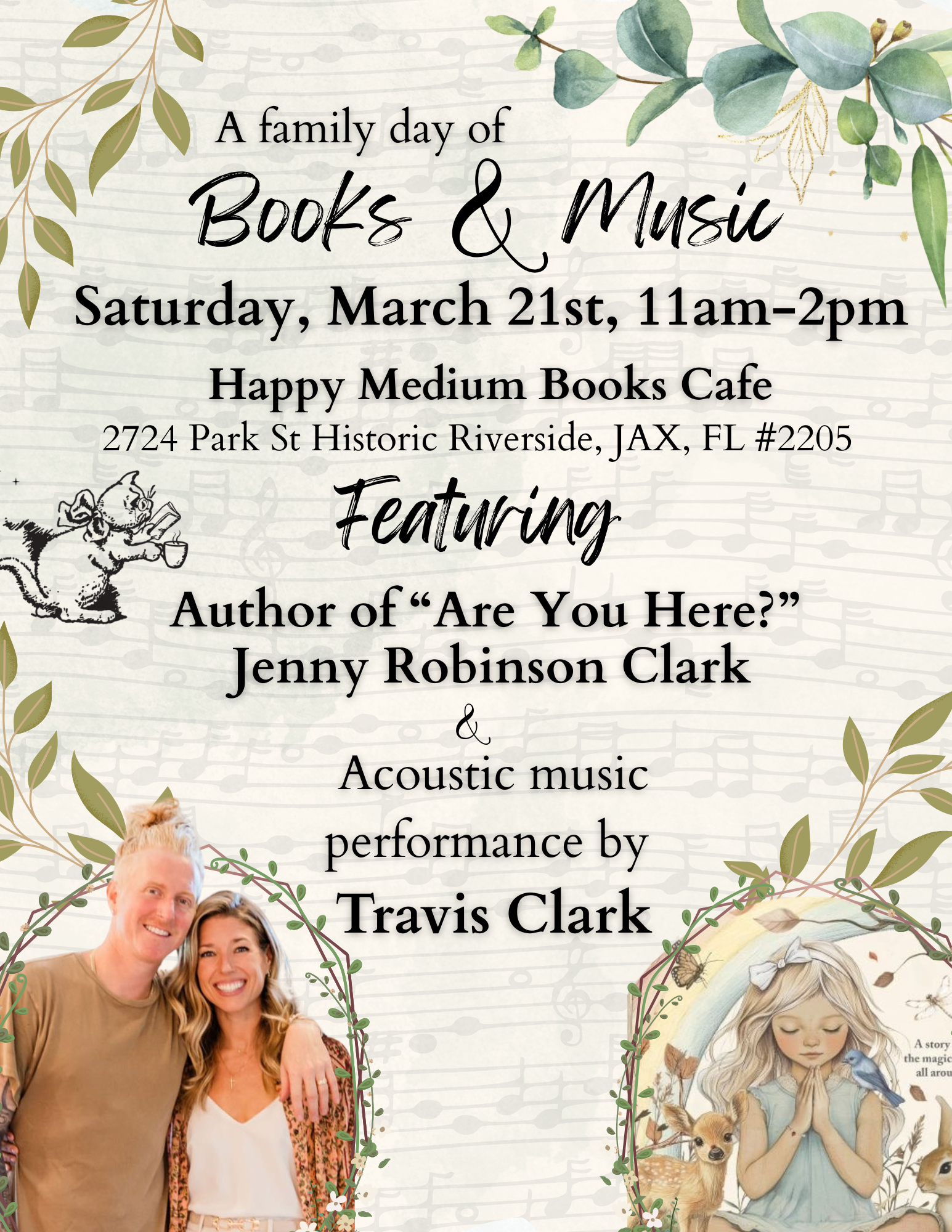 Happy Medium Books Cafe 2724 Park St, Jacksonville, FL, United StatesJoin us for a heart-centered family gathering at Happy Medium Books Cafe as we celebrate the debut of "Are You Here?" by author and mom Jenny Robinson Clark. Created as a gentle way to help children understand grief, love, and connection, "Are You Here?" opens the door for meaningful conversations in a way that feels […]