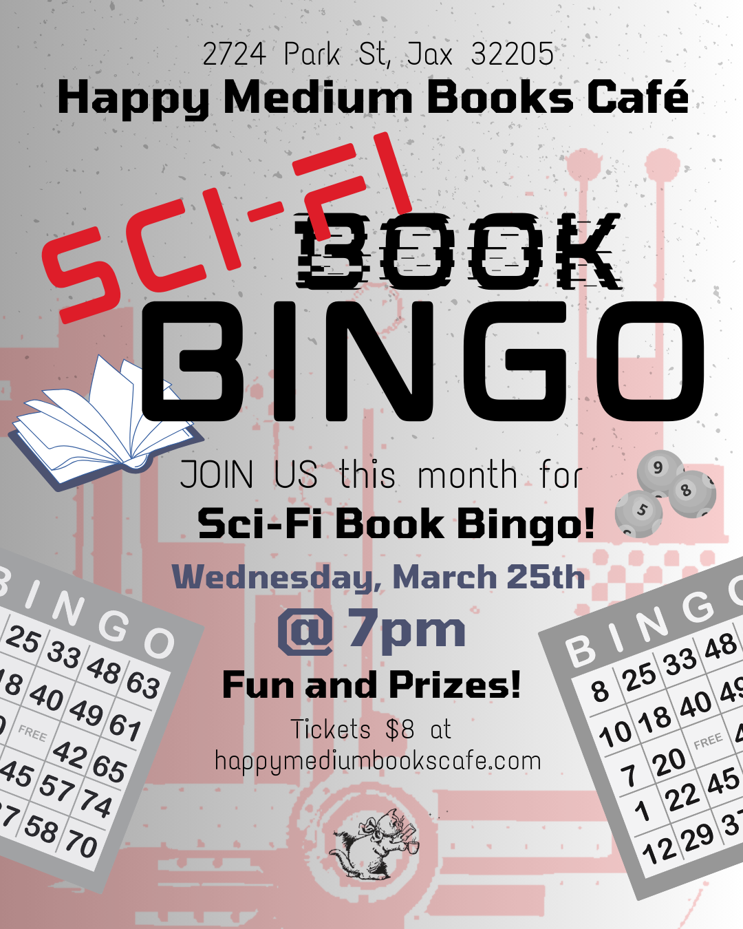 Happy Medium Books Cafe 2724 Park St, Jacksonville, FL, United StatesCalling all Sci fi Fans! This night is for you. Join us for Bingo and your chance at winning for great SciFi Books for prizes. $8 Ticket will hold your space!